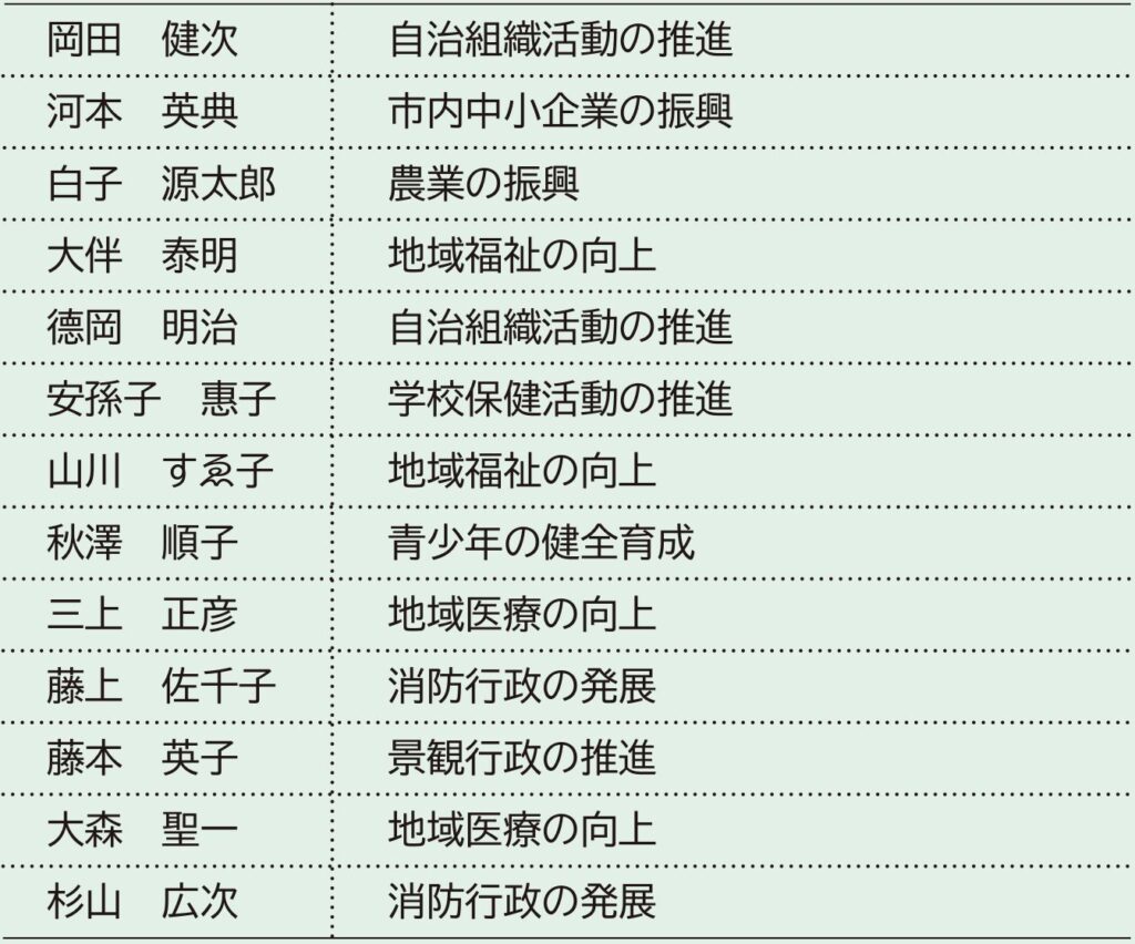 市政功労者は自治行政の振興や公益増進に、社会福祉関係功労者は社会福祉の向上に、文化賞・スポーツ賞は市の文化・スポーツの向上と振興に、教育功績者は教育向上と振興に、それぞれ功績のあった方・団体に贈られます。