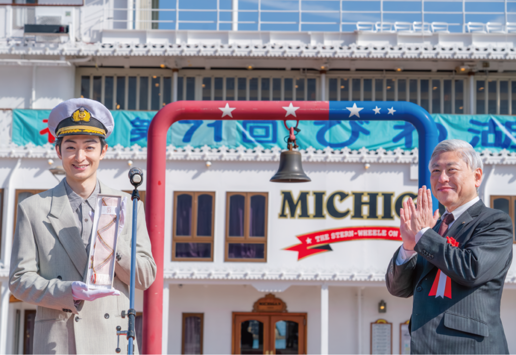 今年の一日船長は、連続テレビ小説「ばけばけ」に出演の濱正悟さん。昨年は撮影のため、10回以上滋賀県を訪れ、三井寺など市内も散策されたそうです。